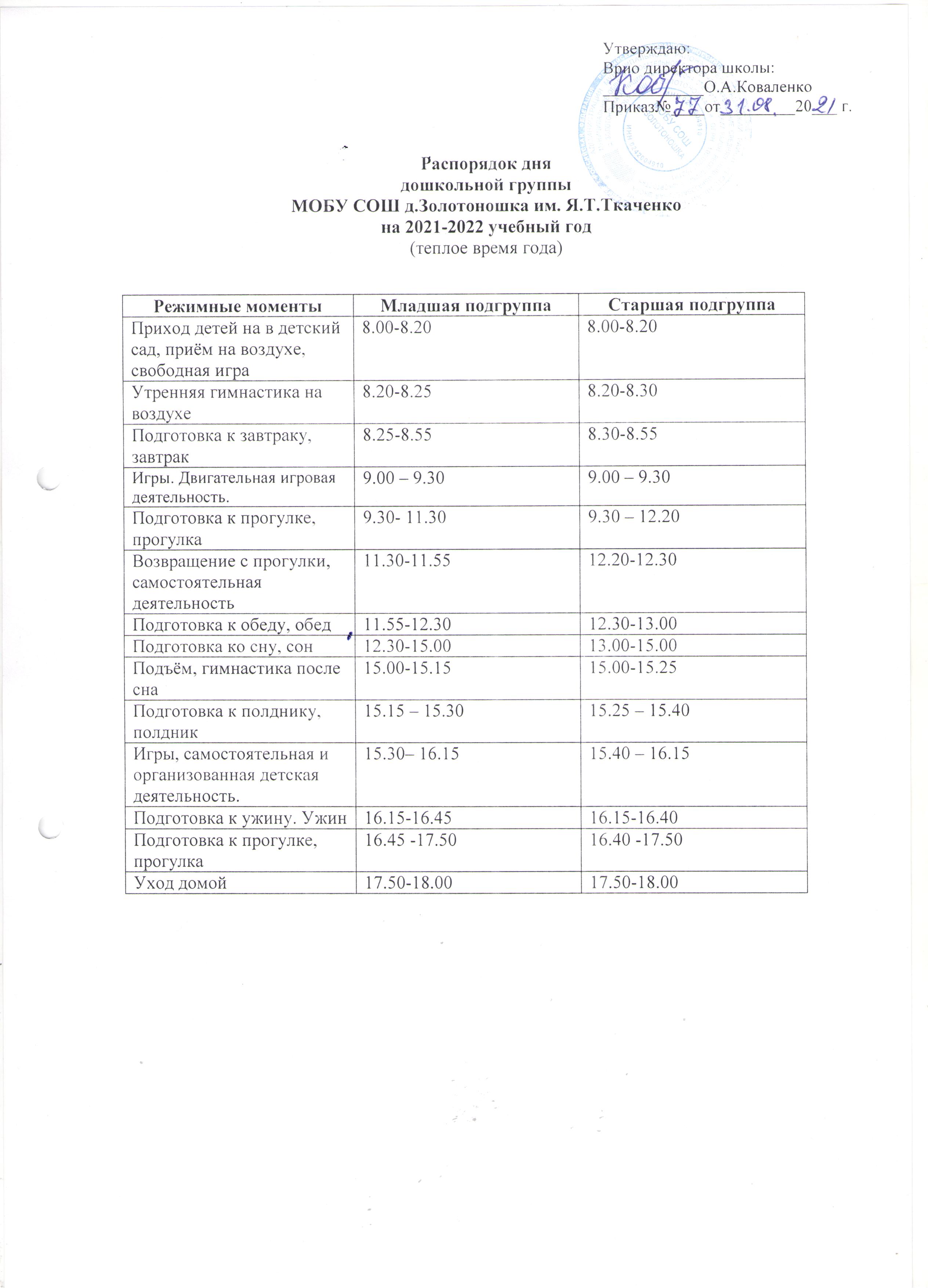 Распорядок дня на теплый период года